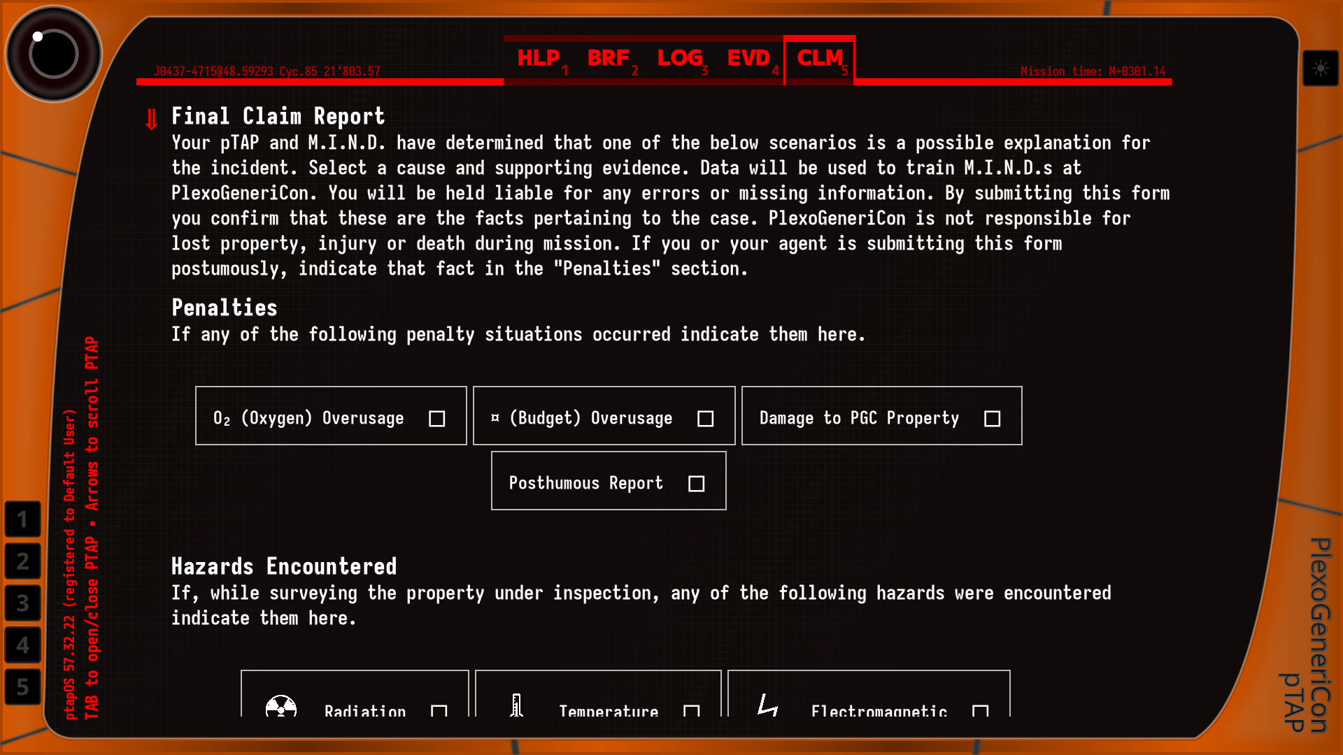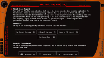 Welcome player, to the rough demo of Cayenne M'Cormik! The second game ever made about insurance adjusting! In Cayenne M'Cormik you play as the titular character, an insurance adjuster in the far-flung future operating in dangerous environments as a gig worker for PlexoGeneriCon, who is contracted to perform various insurance investigations.